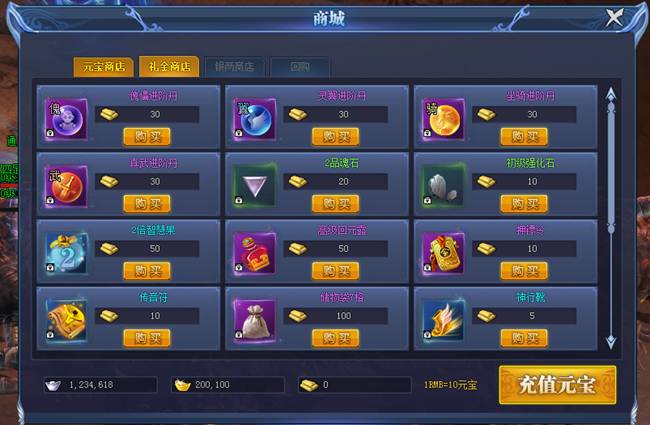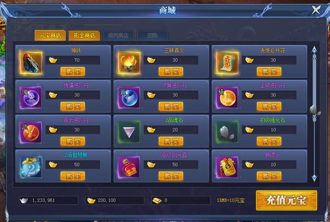 商城内提供了元宝/礼金/银两商店,里面有多种材料出售,玩家可以消耗元宝/礼金/银两来进行购买,更有日常中贩卖给系统的东西可在随身商店中进行回购,避免了玩家误操作出售了珍贵物品后造成损失